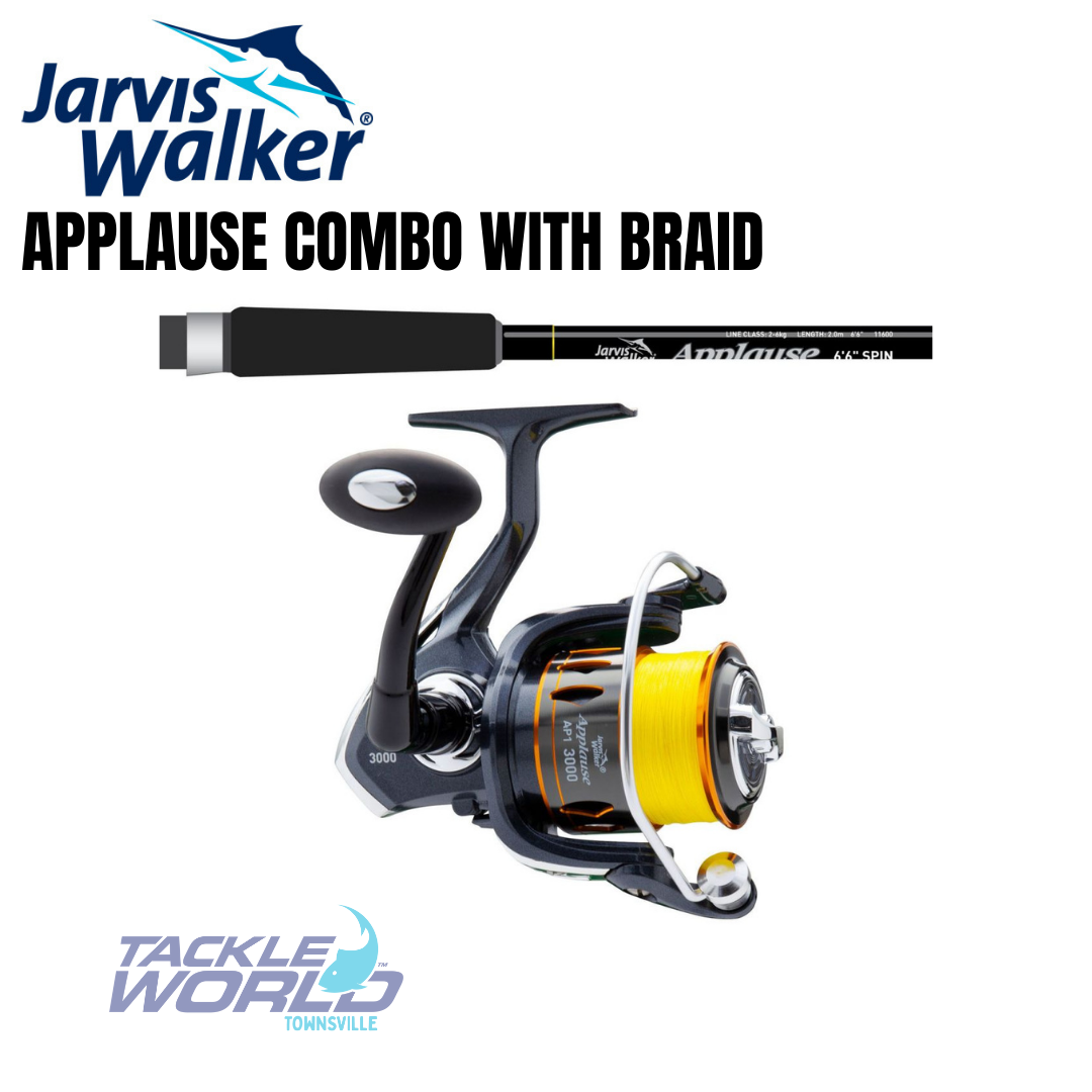 Jarvis Walker Applause Combos leap into the modern braided line era. Each combo includes a braid-ready reel, a heavy-duty inserted solid tip rod, and 150m of braided fishing line that is top-shot over monofilament backing.