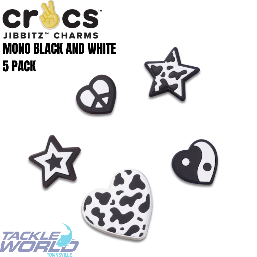 Pop some personality into your shoes with this Mono Black and White Jibbitz™ Charms 5 Pack. This pack is a must-have and the perfect addition to your favourite pairs of clogs, slides, and more. Be sure to secure yours today at Tackle World Townsville.