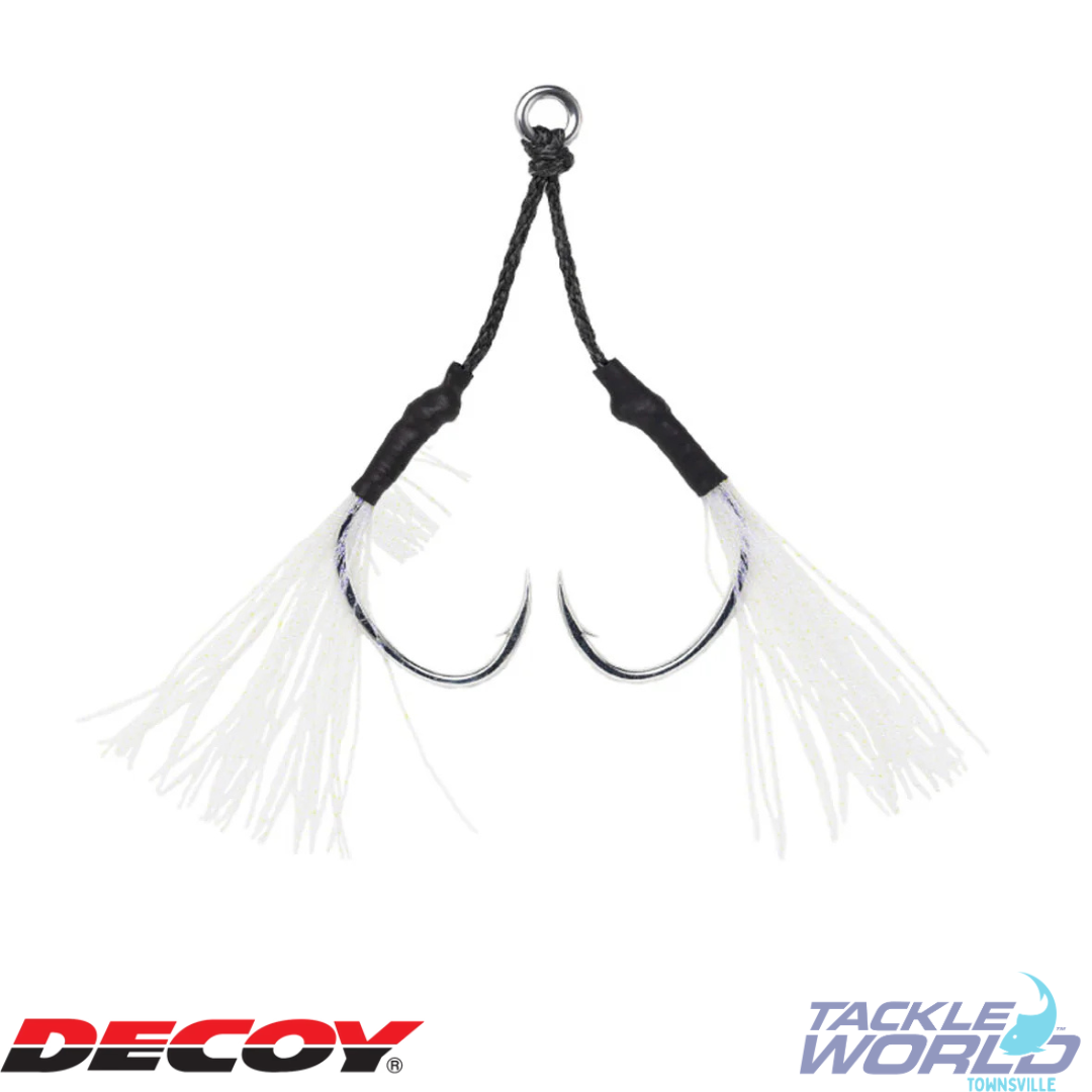 A variation of the popular modern jigging assist hook, the DJ-88 Twin Pike, fitted with flash fibre. The fibre uses a UV-active colour commonly known as ‘keimura,’ which triggers feeding response and helps fish inhale the hook more cleanly. It adds an extra touch of attraction in deep water where light barely reaches, as well as at dawn and dusk. Ideal not only for general pelagic and bottom-fish jigging, but also highly effective for species like hairtail and Spanish mackerel.