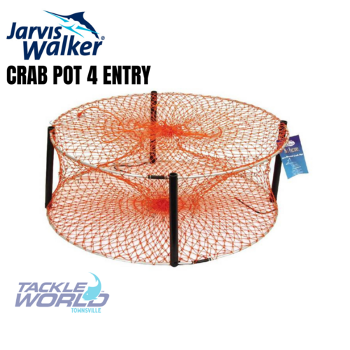 PRO ROUND 4-ENTRY POT! This Pro model has an 800mmdiameter with 300mm PVC upright support stays. It's a collapsible heavy-duty unit. It features 8mm-diameter galvanised rings and heavy-duty nylon mesh with four entrance funnels for crabs.