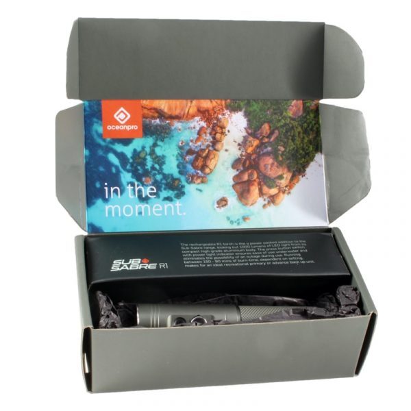 The rechargeable R1 torch is the a power packed addition to the Sub-Sabre range, kicking out 1000 lumens of LED light from its compact high-grade aluminium body. The press button switch with power light indicator ensures ease of use underwater and eliminates the possibility of an outage during use. Running between 150 – 90 mins of burn-time, dependent on setting, makes for an ideal recreational primary or advance back up unit.